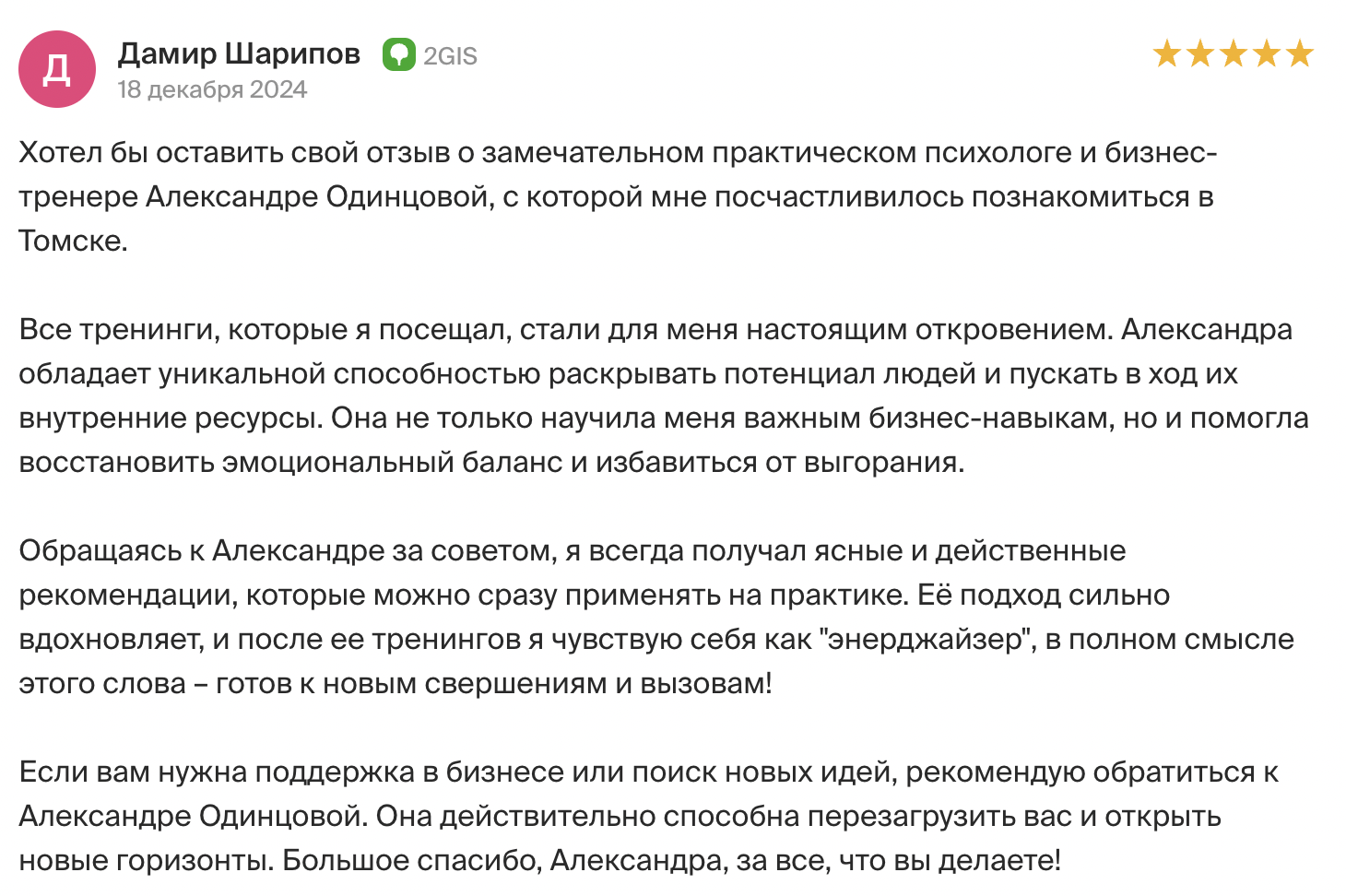 С 2016 года я сотрудничала с топ командами и руководителями следующих компаний: Интер РАО, Русатом, Иннопрактика, Администрация Томской области, Торгово-промышленная палата, "Работа в России" ГазпромТрансгаз, Сибур, Латат, ТГУ, ВШЭ, Сколково, Элекард Мед, Росстат, Иннополис, Клик, ДомТомск, Solagift, ЦНИИМАШ, Роснефть, Открытие Брокер, Роскосмос, Ростелеком, Альфа-Банк, Минцифры и др.
