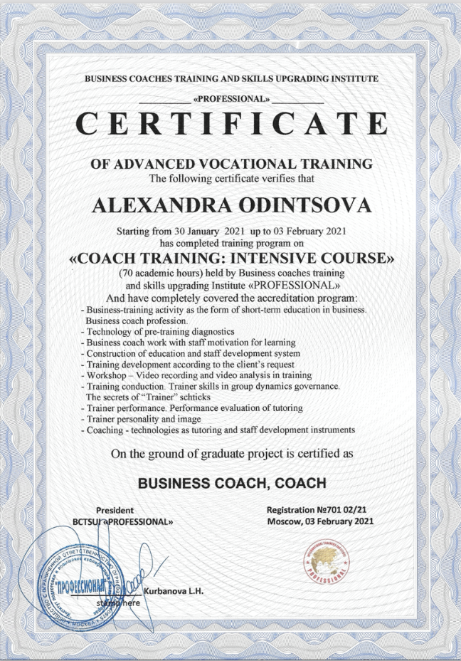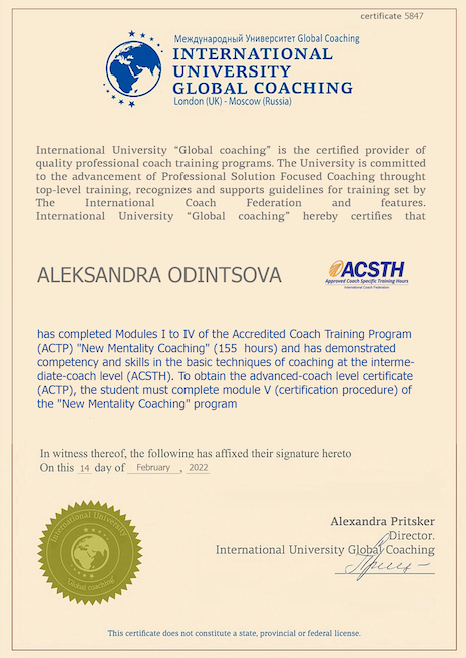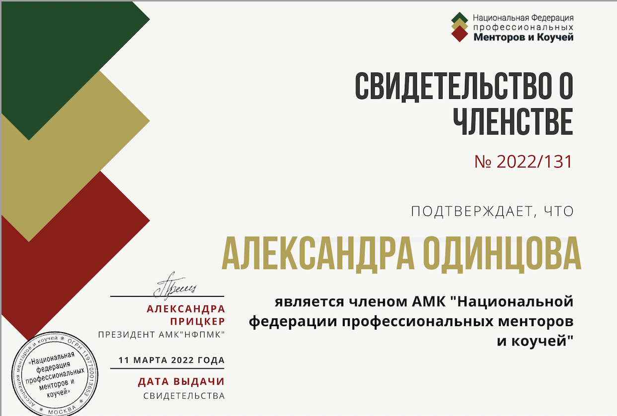 2021, London, International university coaching” (New mentality coaching, Executive coaching), Членство Национальной Федерации профессиональных коучей и менторов