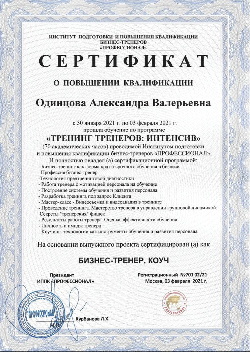 2020, University P&I Обучение трекингу и фасилитации, сертификация «Тренинг тренеров» (бизнес-тренер, бизнес коуч) & Корпоративная сертификация «Внутренний тренер» , Интер РАО